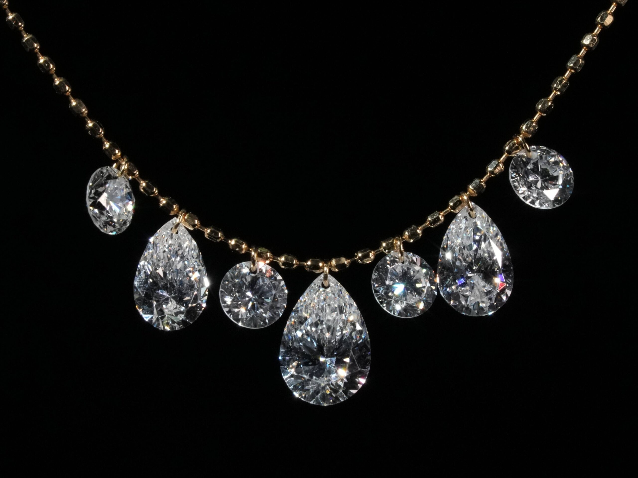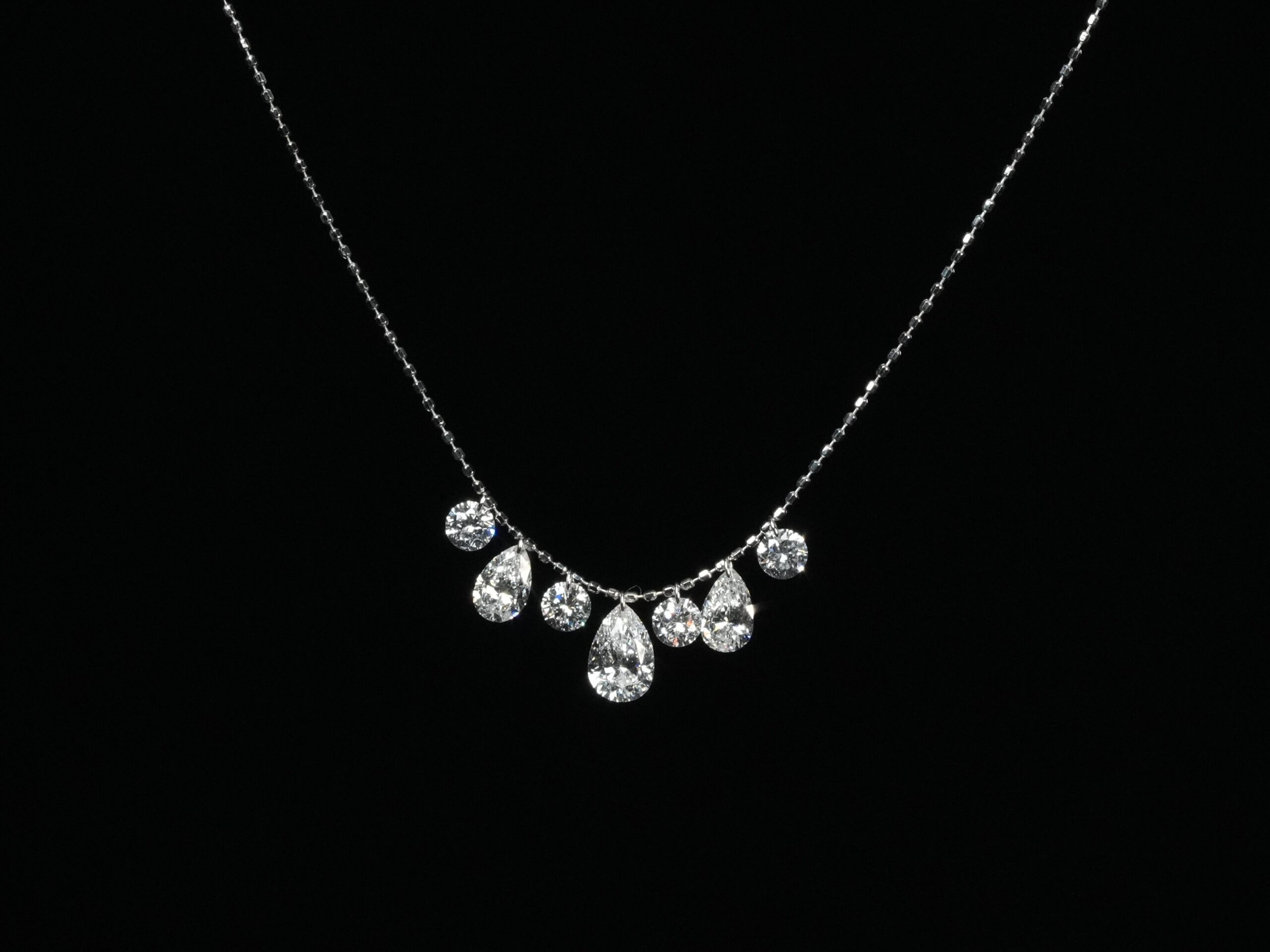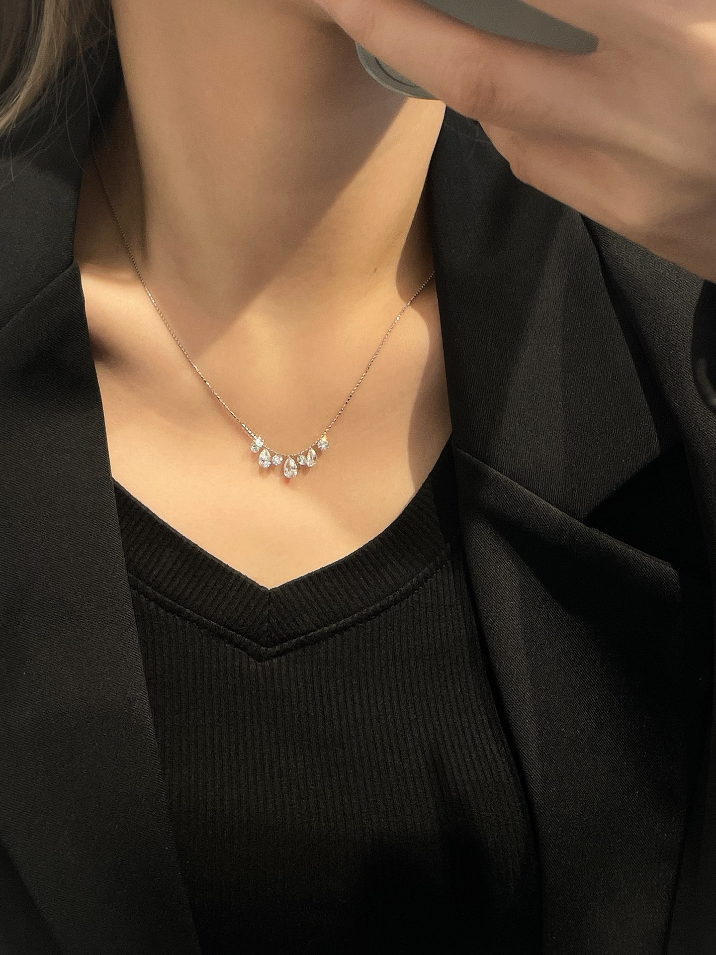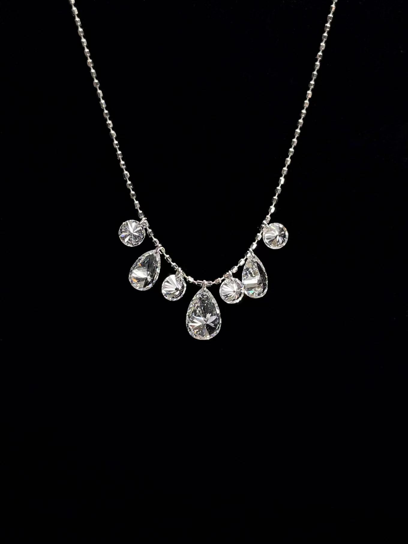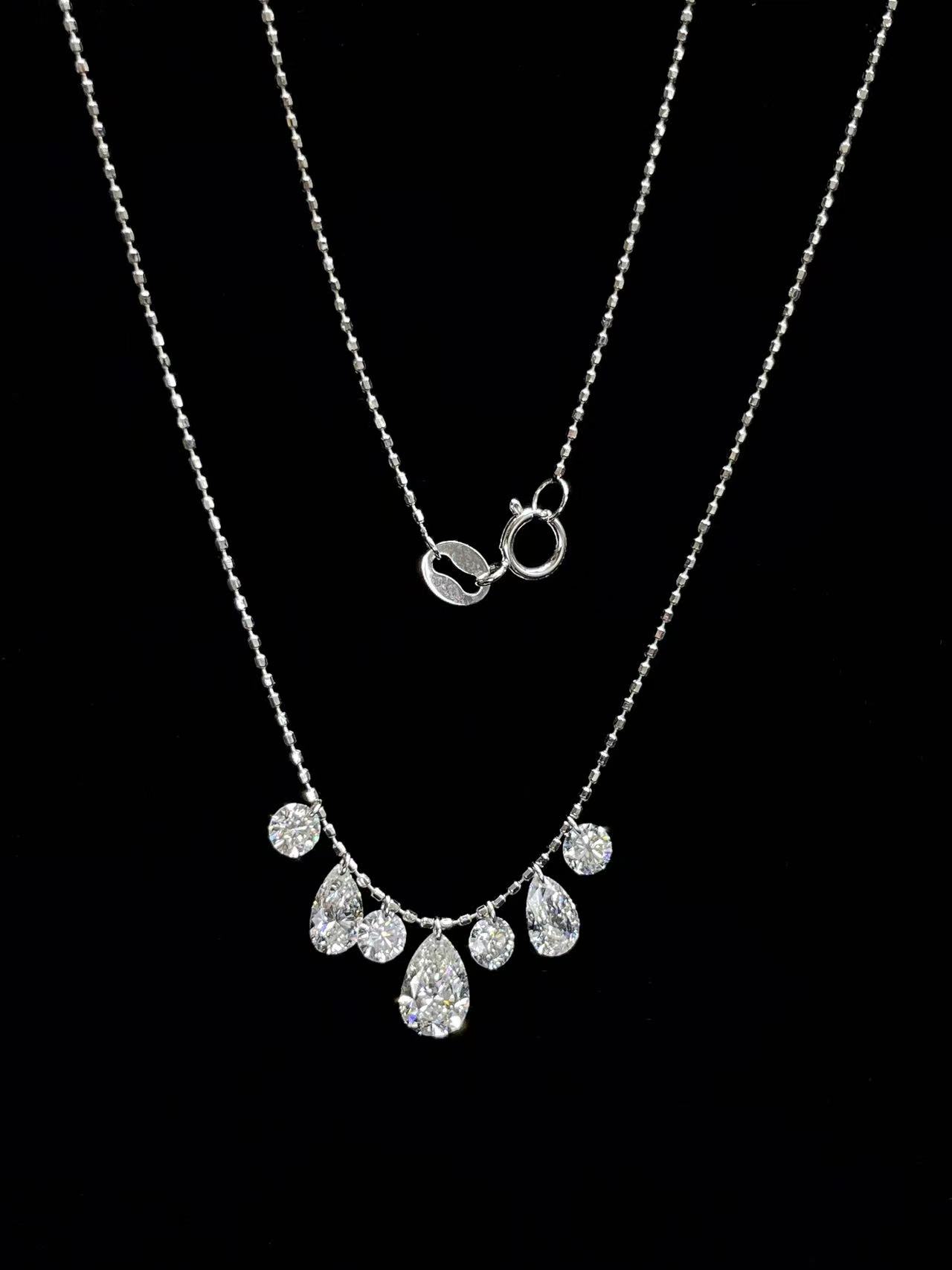 A dazzling display of modern elegance and technical mastery. This “Luminous Rain” necklace features a radiant 0.6-carat pear-shaped center diamond, surrounded by an opulent fringe of six additional pear and round diamonds totaling 1.15 carats. By utilizing advanced micro-laser piercing technology, each diamond is suspended directly without traditional prongs, allowing light to flood through every facet from every direction. The result is a seamless “waterfall” of brilliance that moves gracefully with your every motion.
