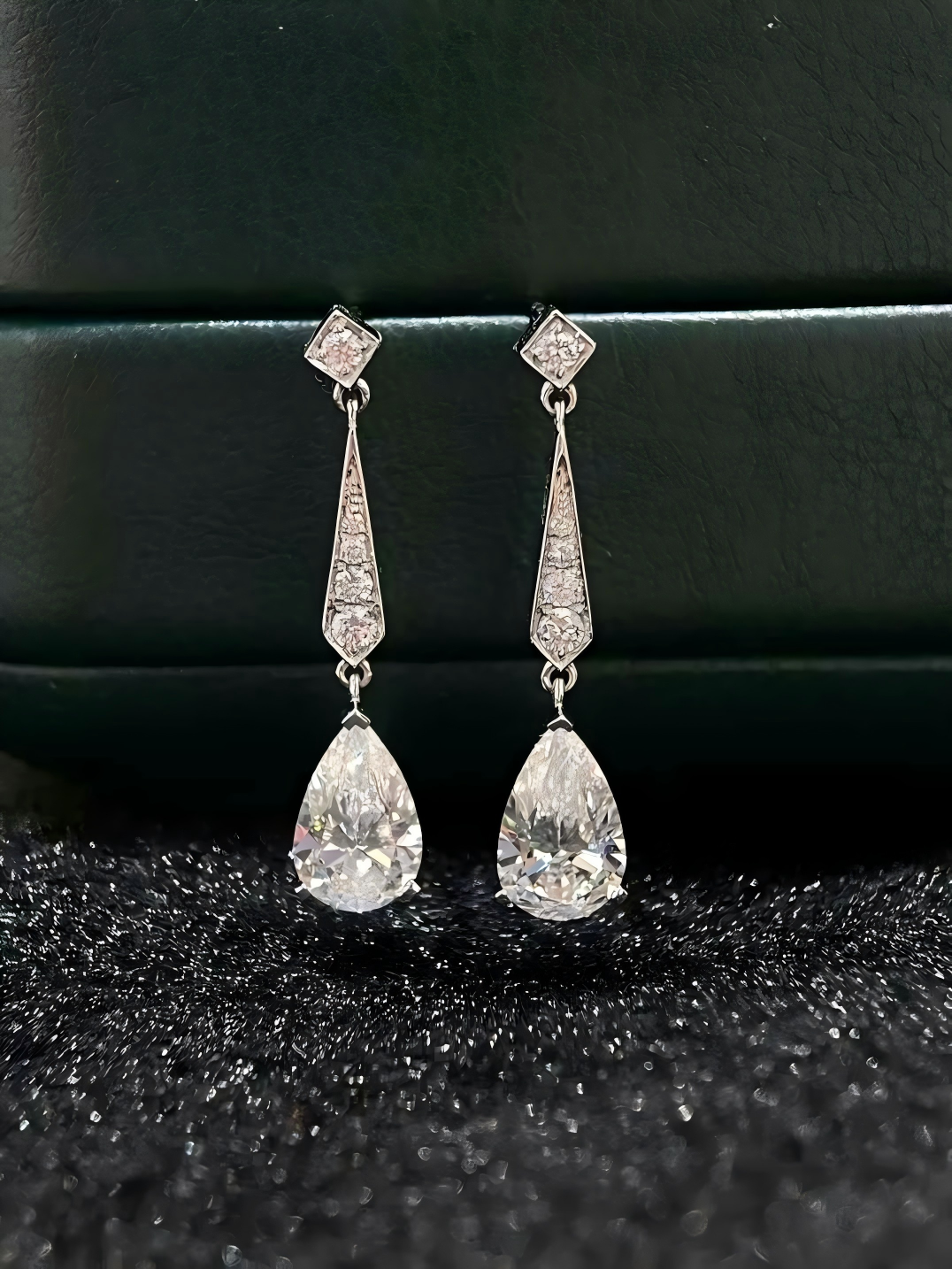 Exude timeless glamour with a modern architectural twist. These “Midnight Gala” earrings feature two majestic 1-carat pear-cut lab-grown diamonds, suspended from an intricate, geometrically-inspired platinum drop. The design draws inspiration from the bold aesthetics of the Art Deco era, combining sharp, tapered metalwork with the soft, organic curves of the teardrop diamonds. Handcrafted in Solid Platinum (Pt950), these earrings offer a balanced weight that speaks to their premium quality, ensuring they hang with perfect poise and unmatched brilliance.